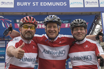 The Ashtons Legal sprint team put in a worthy appearance in Bury St Edmunds yesterday for the final leg of the Women’s Tour of Britain Cycle Race. As the rain lashed down on Angel Hill, the team, made up of Adrian Baker, Mark Merriam and Dave Richardson wondered where the other corporate competitors were. After some investigation the team were told they were the only ones who had turned up. Therefore we are delighted to announce that the only team to turn up became the only team to cross the line and subsequently made an appearance on the winners podium, just hours before the real winners of the day arrived on Angel Hill.